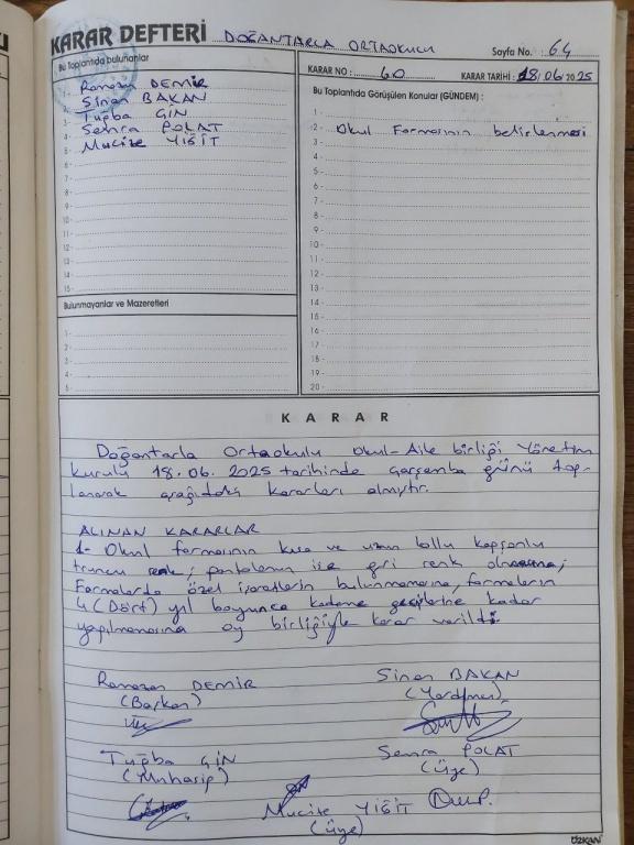 2025-2026 Eğitim-Öğretim yılından itibaren geçerli olmak üzere 4(dört) yıl boyunca kullanılacak okul forması okul-aile birliği kararı ile belirlenmiştir. Karar ve okul forması görseldeki şekildedir.